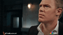 Donald Ressler from The Blacklist deep in thought, with the NBC logo visible.