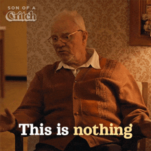 Patrick Critch, an old man, sits in a chair with the text "This is nothing" displayed, from the show Son of a Critch.