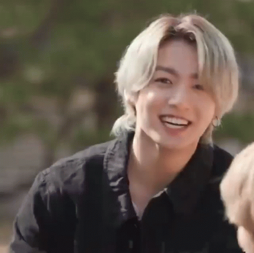 Jungkook from BTS smiles brightly and gives a cheerful thumbs up, showing his approval.