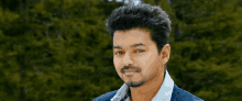Thalapathy Vijay from the movie Thuppakki, smiling and looking stylish in a blue jacket.