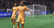 Tigres UANL players Diente Lopez, Luis Quiñones, Sebastian Cordova, and Vigon perform a synchronized goal celebration in FIFA 22.