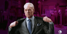 Tim Gunn, the fashion guru, puts on his coat while sitting in a chair, ready for Project Runway.