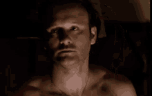 Tim McGraw, shirtless, looks intensely at the camera in a dimly lit room, creating a dramatic mood.