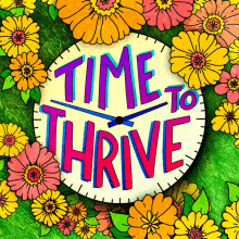 Vibrant illustration of a clock with 'Time To Thrive' text, surrounded by colorful flowers and daisies.