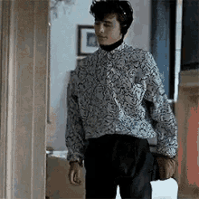 Timothy, a young man with dark hair, looks down and then up, wearing a distinctive patterned shirt.