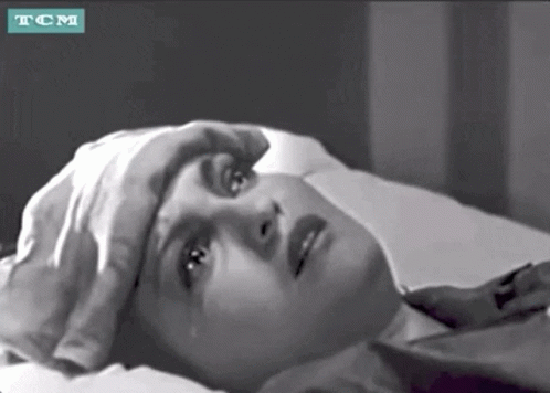 A distressed woman lies in bed, hand on forehead, a tear visible, conveying exhaustion and a headache.