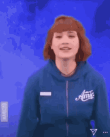 Tish Tish Dots, the Amici18 winner, joyfully smiles and makes 'okay' signs in a blue hoodie.