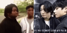 Jungkook and V (Taekook) in a fan-made meme, with Korean captions about taking a selfie for kids.