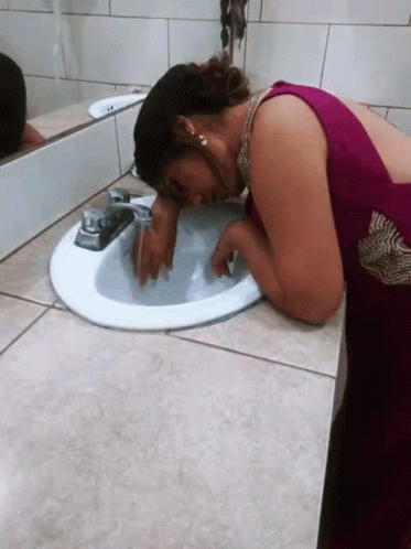 Woman in a pink dress with her head in a bathroom sink, looking unwell after a party.