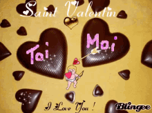 A Valentine's Day card with chocolate hearts, a Cupid, and the message 'You & Me, I Love You!'