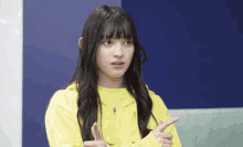 Aki Suda from Tokimeki Sendenbu, wearing a yellow hoodie, points while engaged in a conversation.