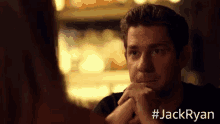 John Krasinski as Jack Ryan, looking intently with hands clasped, with the #JackRyan hashtag visible.