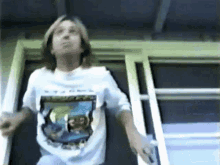 A person wearing a Tom Petty t-shirt jumps out of a window in a low-quality, vintage video.