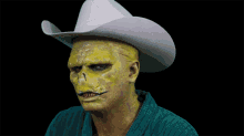 Mac De Marco in a creepy face mask and cowboy hat, sticking his tongue out.