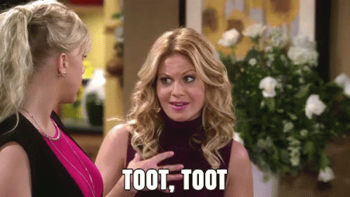 Candace Cameron Bure from Fuller House says 'Toot, Toot' while standing next to Jodie Sweetin.