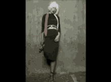 Tori Amos poses in a black dress with a white scarf and red sash against a grey wall.