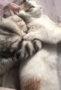 Two adorable cats cuddling closely on a bed, one with gray stripes and the other white with brown patches, showing affection.