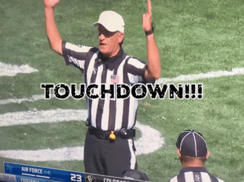 A referee signals a touchdown on an American football field with the word 'Touchdown' displayed.
