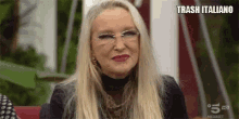 Eleonora Giorgi looking confused during Grande Fratello Vip, wearing glasses and a dark top.