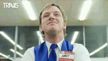 Andy Dunlop from Travis smiles and nods in a grocery store setting, embodying pride and approval.