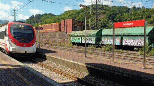 A red and white Renfe train arriving at La Felguera station in Spain.