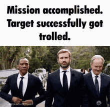 Three men in suits walk confidently as an overlaying caption declares 'Mission accomplished. Target successfully got trolled.'