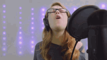 Babs, wearing glasses and headphones, passionately sings into a microphone at a Ttrpgifs Dance Party.