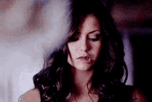 Nina Dobrev as Katherine Pierce biting her lip, showing a seductive and intense expression.