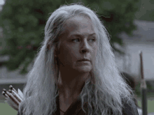 Carol Peletier from The Walking Dead, with long gray hair and a quiver of arrows, looks intently.