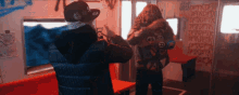 Yeat and Yung Kayo performing the Twizz Shake dance in a graffiti-filled room.