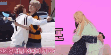 K-pop idols Beomgyu, Soobin, Chaeyoung, and Jiheon from TXT and fromis_9 share warm hugs in a compilation.