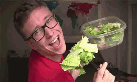 Tyler, a young man in glasses, enthusiastically eats a large salad from a plastic container.