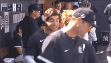 Tyler Wade and Clint Frazier share a moment with New York Yankees teammates in the dugout during a baseball game.
