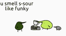 Animated cartoon with blob creatures and a blender, featuring the text 'u smell s-sour like funky'.
