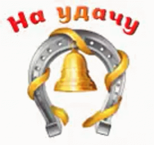 Animated silver horseshoe with a golden bell and ribbon, wishing 'Good Luck'.