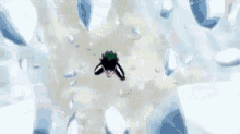 Izuku Midoriya kneels amidst a bright light, preparing for action.
