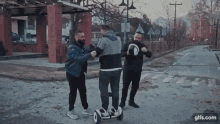 Members of Unboxholics help a friend learn to ride a segway scooter in an outdoor setting.