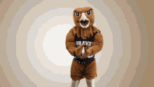 The UNC Pembroke Braves mascot, Brave Hawk, claps its hands and gives a thumbs up.