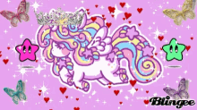An adorable animated unicorn with a crown, surrounded by sparkling stars, hearts, and butterflies.