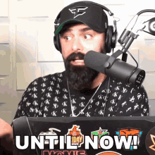 Keemstar, also known as Daniel Keem, reacts with a surprised expression, exclaiming 'Until Now!' into a microphone.