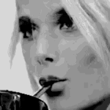 Valentina Zenere, known for her role as Ambarsmith, elegantly sips from a cup with a straw in this striking black and white close-up.