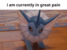 Vaporeon meme featuring the text 'i am currently in great pain', expressing suffering and distress.