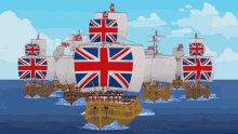 A fleet of cartoon British sailing ships, adorned with Union Jack flags, navigates the open sea.