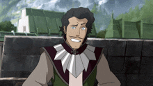Varrick and Asami from Legend of Korra react with contrasting expressions, Varrick with a wide smile and Asami looking surprised.