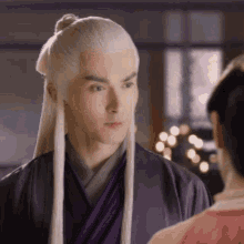 Vengo Gao, as Donghua Dijun, a man with long white hair, looks intently at a woman in a pink dress.