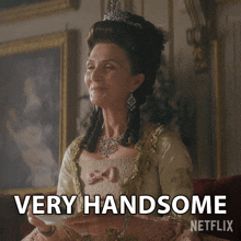 Princess Augusta, played by Michelle Fairley, looking very handsome in her regal attire from Queen Charlotte: A Bridgerton Story.