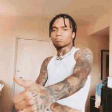 Swae Lee vibing and giving a thumbs up, wearing a white tank top with dreadlocks and tattoos.