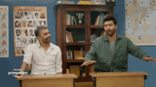 Vicky Kaushal and another man react with relief at desks, in a scene titled 'Baal Baal Bach Gaye'.