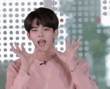 Victon's Jung Subin in a pink sweater makes a cute 'woof woof' gesture with his hands.