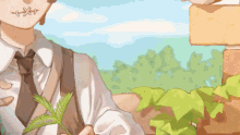 Victor Grantz, the postman from Identity V, with his dog, examining a plant in a garden.